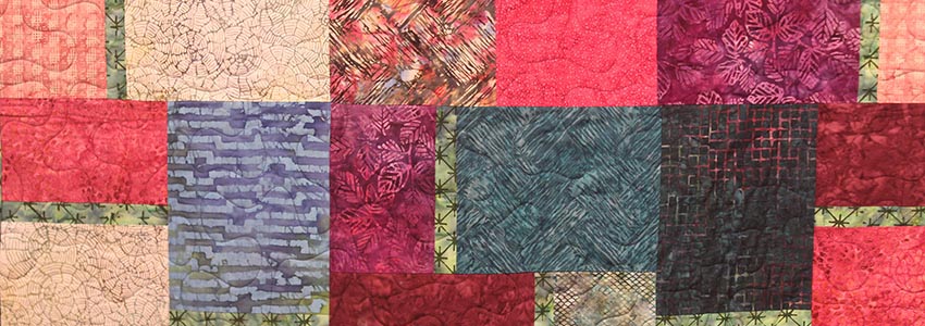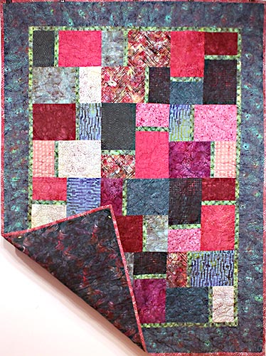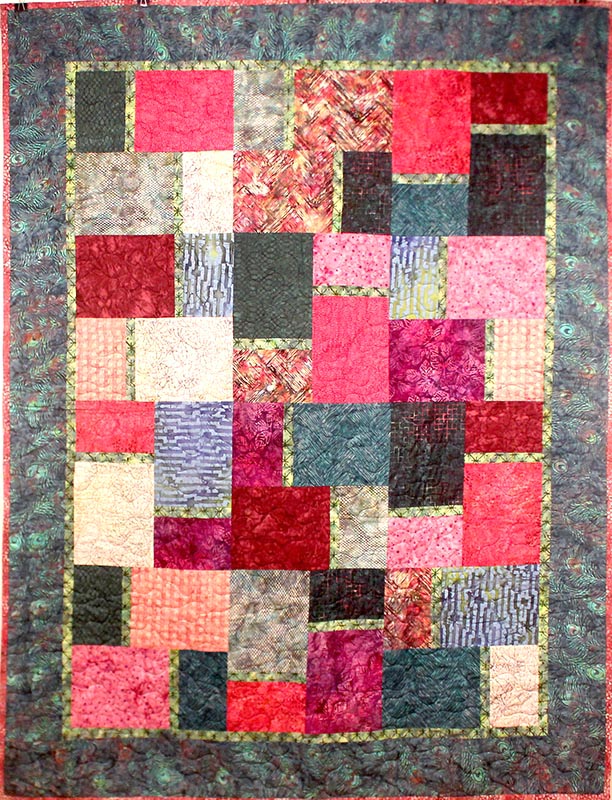 | Emerald Isle, 63" by 79" $200.00 plus shipping. I select 100% cotton from Designer Collections favoring modern, contemporary designs. I machine piece the top, make the backing and double binding. The quilt is long arm quilted and bound at the Murray Sewing Center. The batting is 80/20 cotton/polyester and the binding is machine stitched on the front and hand stitched on the back. The quilt can be laundered in cold water on the gentle cycle and dried on low or air dried. email me here |