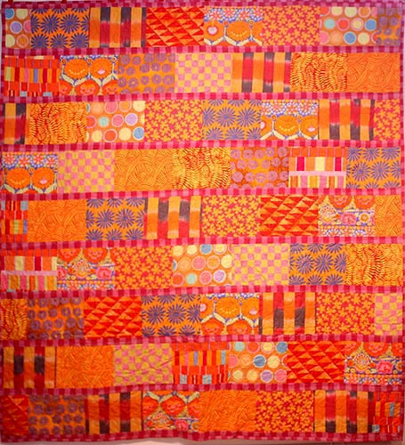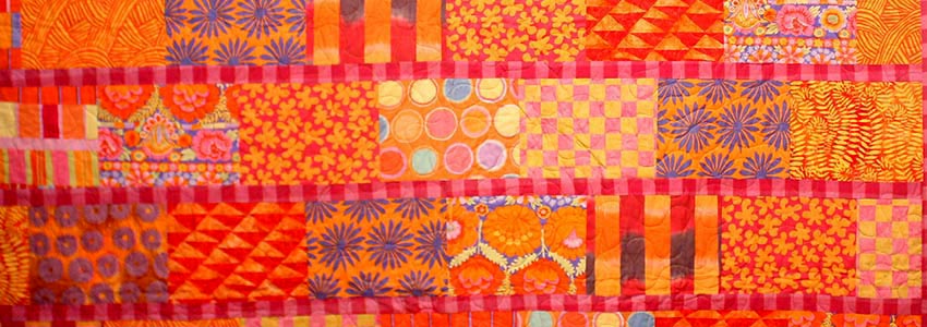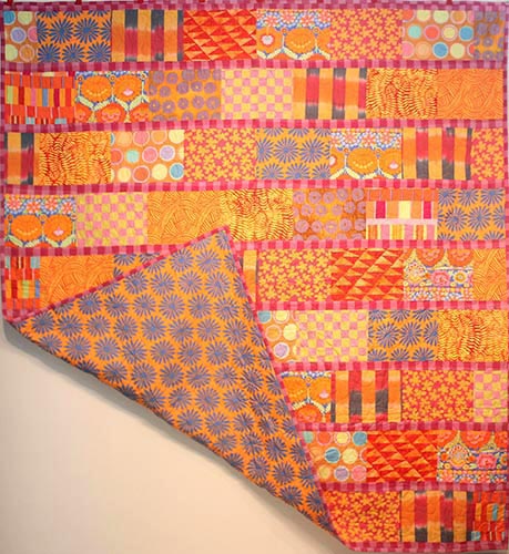 | Yellow Brick Road 82" by 90" $260.00 Sold plus shipping. I select 100% cotton from Designer Collections favoring modern, contemporary designs. I machine piece the top, make the backing and double binding. The quilt is long arm quilted and bound at the Murray Sewing Center. The batting is 80/20 cotton/polyester and the binding is machine stitched on the front and hand stitched on the back. The quilt can be laundered in cold water on the gentle cycle and dried on low or air dried. email me here |