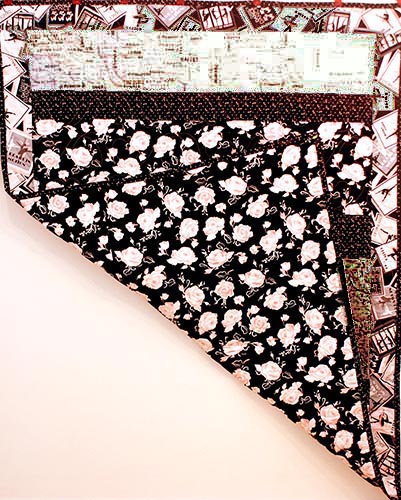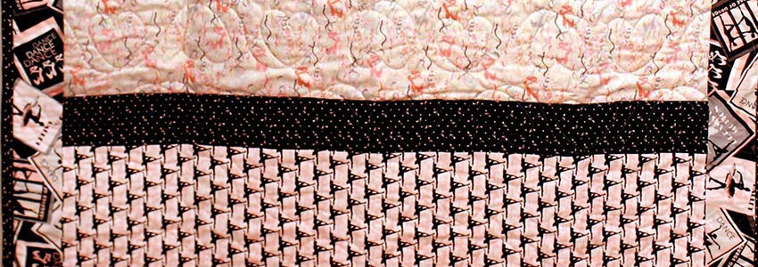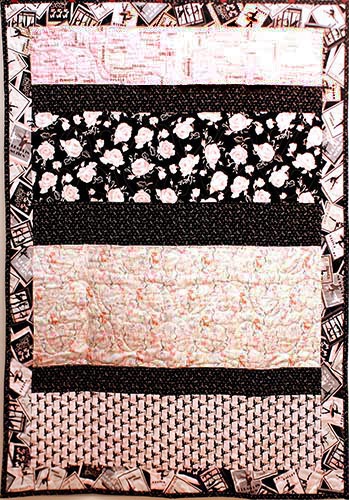 | PrimaBallerina 50" by 65" $125.00 Sold plus shipping. I select 100% cotton from Designer Collections favoring modern, contemporary designs. I machine piece the top, make the backing and double binding. The quilt is long arm quilted and bound at the Murray Sewing Center. The batting is 80/20 cotton/polyester and the binding is machine stitched on the front and hand stitched on the back. The quilt can be laundered in cold water on the gentle cycle and dried on low or air dried. email me here |